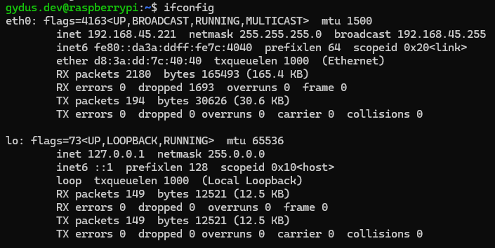 - ifconfig 을 입력하고 본인의 ip를 확인합니다. 출력된 결과 중 eth0 또는 wifi를 사용할 경우 wlan0을 찾고 해당 라인의 inet항목이 해당 네트워크에서 사용하는 ip주소입니다.