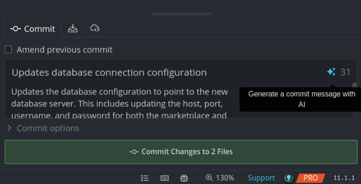 대표 AI 기능으로는 자동 커밋 메시지 생성이다. 커밋할 파일을 스테이지에 올리면 AI가 파일을 읽고 commit 메시지를 생성해준다.