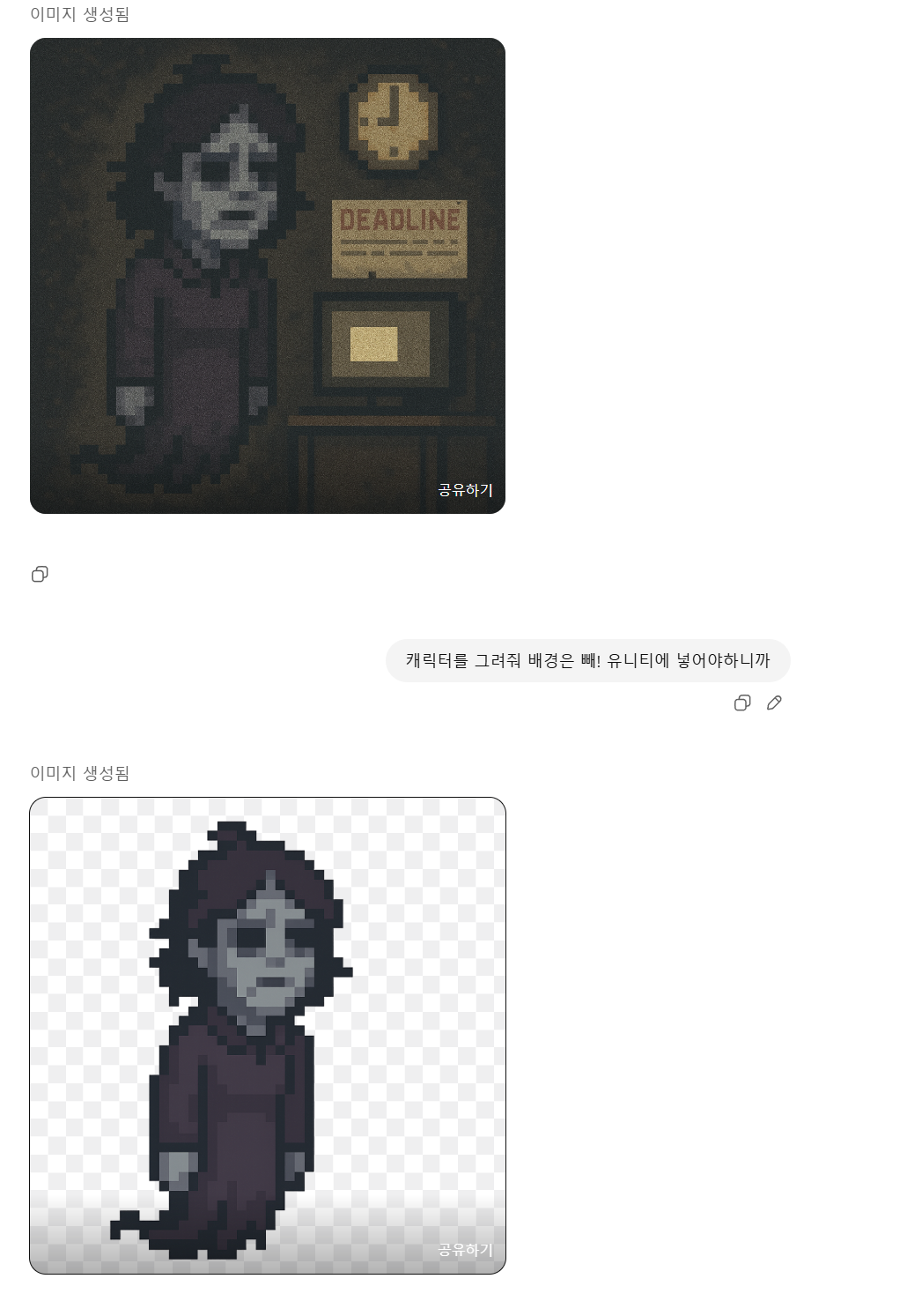 아래는 GPT-4o으로 생성한 게임 캐릭터 설정을 만들고 사용할 도트 이미지를 생성한 결과이다. 용도에 맞게 배경 투명화 등 수정을 해준다. 이러한 기능을 잘 활용한다면 정말 혼자서 상상만 하던 것을 구체화시킬 수 있을 것이다.