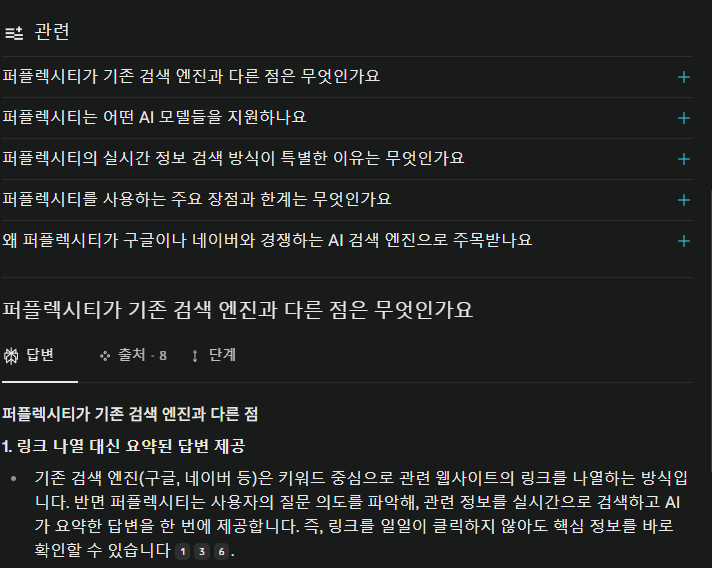 추가로 답변이 끝나면 내가 질문했던 내용관 관련된 후속 질문을 추천해 준다. 이 기능을 통해 내가 했던 질문의 내용을 더 깊게 이해할 수 있게 되고 혼자 AI와 브레인스토밍을 하는 느낌이 든다.