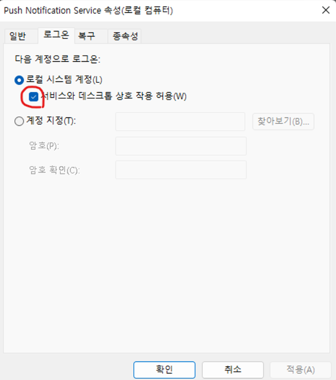 10. 서비스 (Windows + R → services.msc)를 열어 등록한 서비스를 찾고 우클릭 → 속성 → 로그온 → ‘서비스와 데스크톱 상호 작용 허용’ 체크합니다.