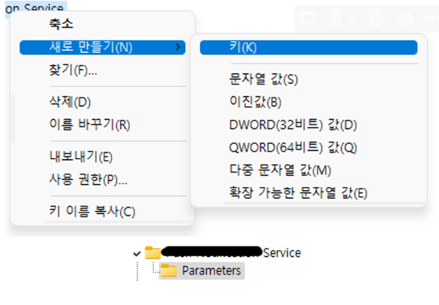 6. 서비스 우클릭 → 새로 만들기 → 키 생성 → Parameters 를 클릭합니다.